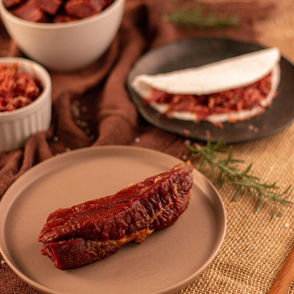 A Carne Seca Artesanal Defumada é preparada com carne bovina selecionada e passa por um cuidadoso processo de salga e defumação lenta em baixa temperatura. O resultado é um produto com sabor intenso e aroma defumado, pronto para diversas preparações. Diferente da carne seca tradicional, esta versão não necessita de dessalga, proporcionando mais praticidade no preparo.