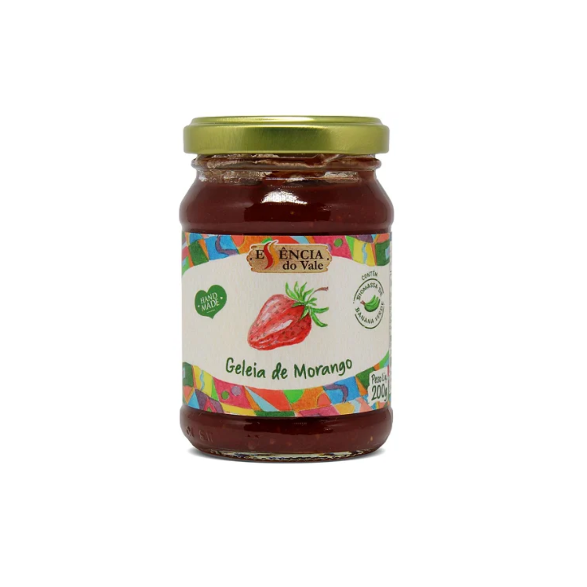 Produzida com o morango fruta congelada, enriquecida com biomassa de banana verde, sem adição de corantes, aromatizantes e conservantes químicos.