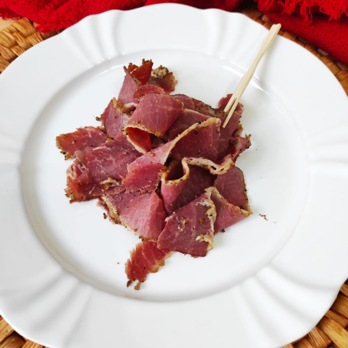 Nosso Pastrami Defumado Fatiado é elaborado com carne bovina cuidadosamente selecionada, marinada em uma combinação de especiarias aromáticas, defumada lentamente em baixa temperatura e envolta em uma camada de grãos de pimenta preta e mostarda macerados. O resultado é uma carne macia, saborosa e cheia de personalidade, perfeita para diversas preparações.