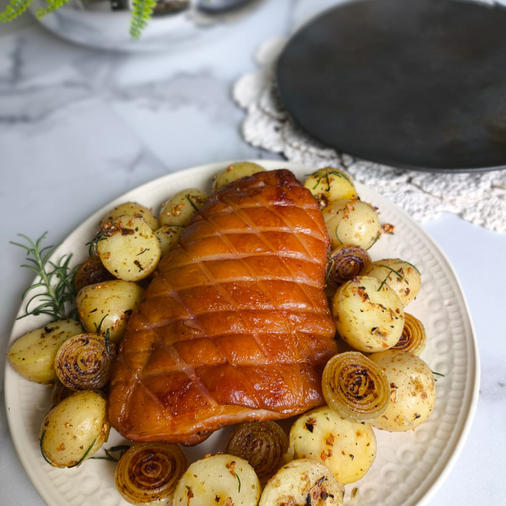 Deliciosa e suculenta picanha suina defumada, pronta para consumo.